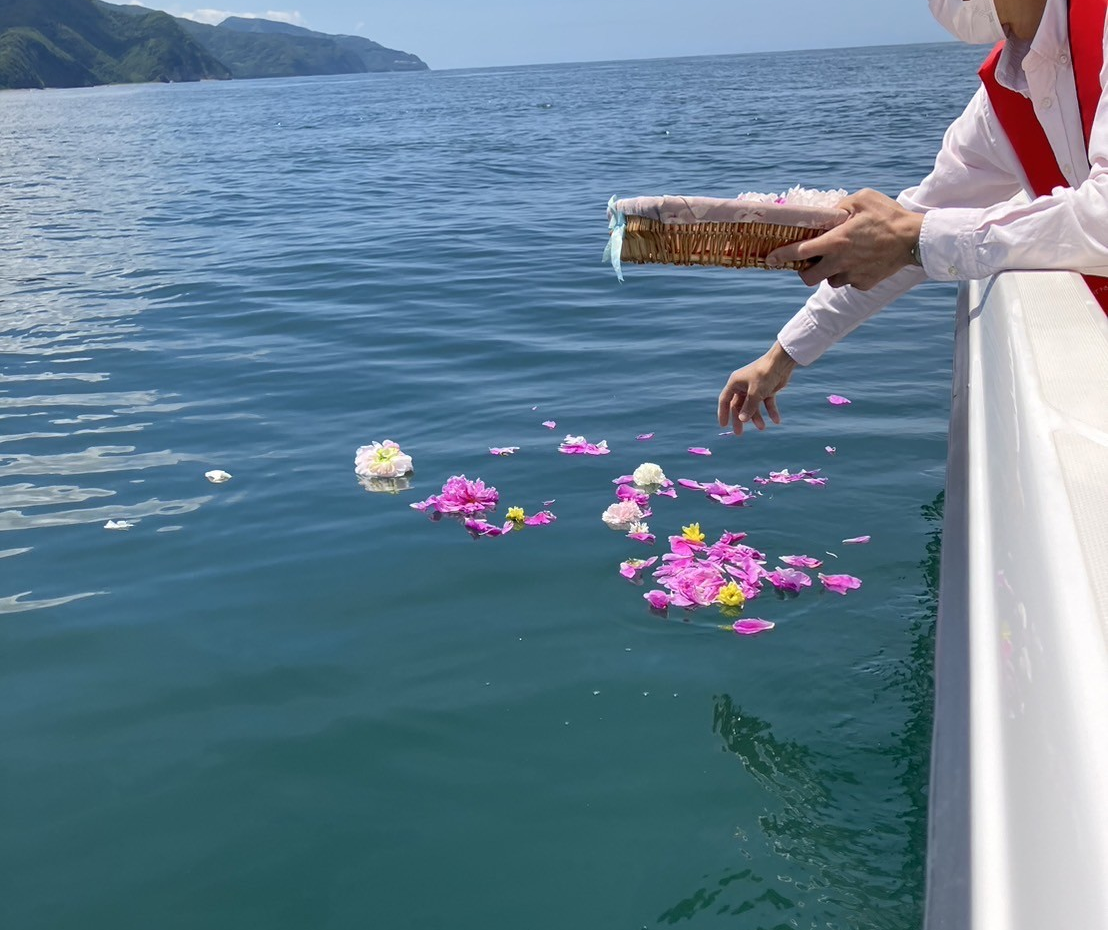 穏やかな駿河湾に散骨をし、色とりどりの季節のお花で