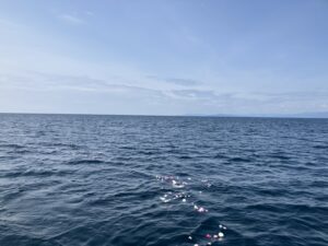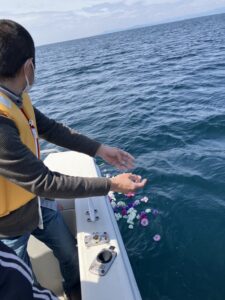 献花したお花と共に大海原へご出発です